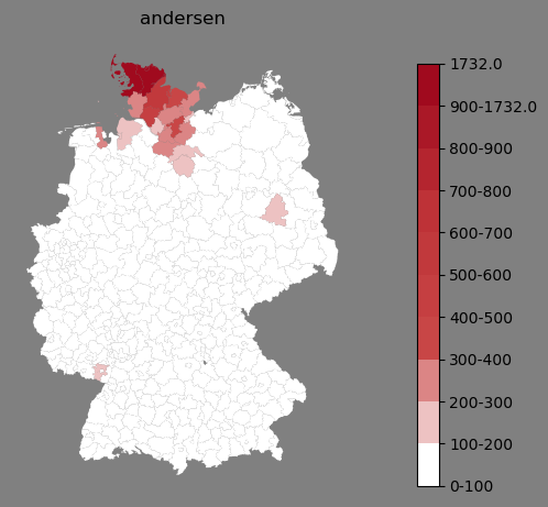 Relative Verteilung des Namens andersen (1996)Direkt zur Karte Die Farbskala zeigt die Anzahl von "andersen" bezogen auf je 1 Million Einträge. |