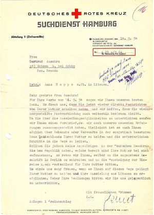 - 1953 stellte der Suchdienst des DRK in Hamburg für Gertrud Auschra, die Tochter, eine Mitteilung aus, die den Verbleib des Bruders Franz Johann Hoppe und die Mutter betraf. Beim Bruder konnte nicht geholfen werden, und man verwies Gertrud Auschara auf das DRK in Hannover. Für die Mutter gab es wenigstens eine Bestätigung über den Eingang des Schreibens vom 7. Februar 1953.