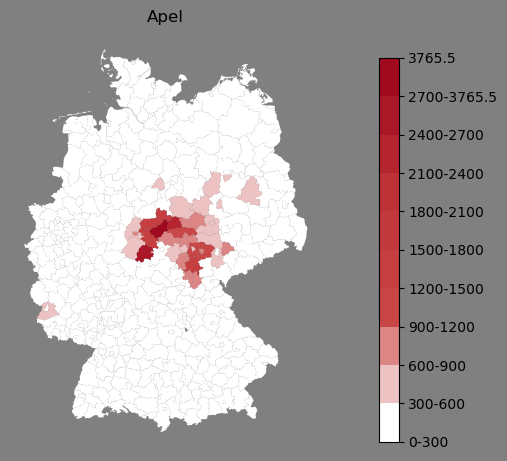 Absolute Verteilung des Namens Apel (1890)Direkt zur Karte Absolute Verteilung des Namens "Apel" um 1890 im damaligen Deutschen Reich Sie können die Karte innerhalb des Fensters zoomen und verschieben. |