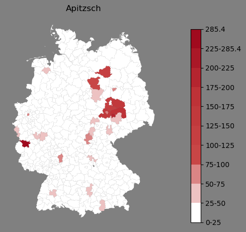Relative Verteilung des Namens Apitzsch (1996)Direkt zur Karte Die Farbskala zeigt die Anzahl von "Apitzsch" bezogen auf je 1 Million Einträge. |