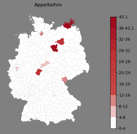 Relative Verteilung des Namens Appelbohm (1996)Direkt zur Karte Die Farbskala zeigt die Anzahl von "Appelbohm" bezogen auf je 1 Million Einträge. |