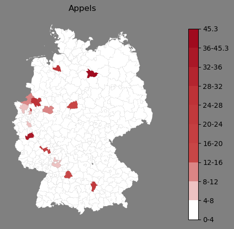 Relative Verteilung des Namens Appels (1996)Direkt zur Karte Die Farbskala zeigt die Anzahl von "Appels" bezogen auf je 1 Million Einträge. |