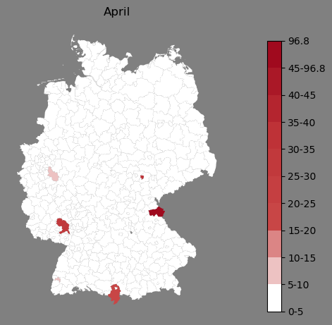 Absolute Verteilung des Namens April (1890)Direkt zur Karte Absolute Verteilung des Namens "April" um 1890 im damaligen Deutschen Reich Sie können die Karte innerhalb des Fensters zoomen und verschieben. |