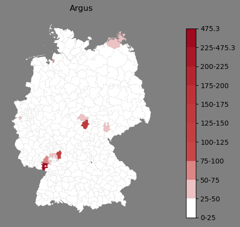 Relative Verteilung des Namens Argus (1996)Direkt zur Karte Die Farbskala zeigt die Anzahl von "Argus" bezogen auf je 1 Million Einträge. |