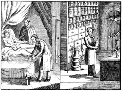 Alsdann schreibt der Arzt die Arznei auf ein Zettelchen vor (Rezeptur), welches man in die Apotheke trägt, wo die verschiedenen Arzneimittel bereitet werden.