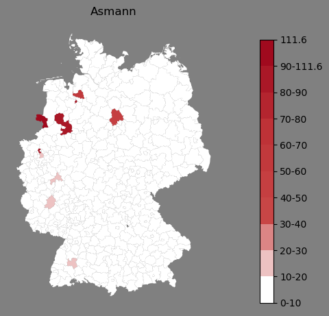 Relative Verteilung des Namens Asmann (1996)Direkt zur Karte Die Farbskala zeigt die Anzahl von "Asmann" bezogen auf je 1 Million Einträge. |