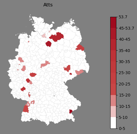 Relative Verteilung des Namens Atts (1996)Direkt zur Karte Die Farbskala zeigt die Anzahl von "Atts" bezogen auf je 1 Million Einträge. |