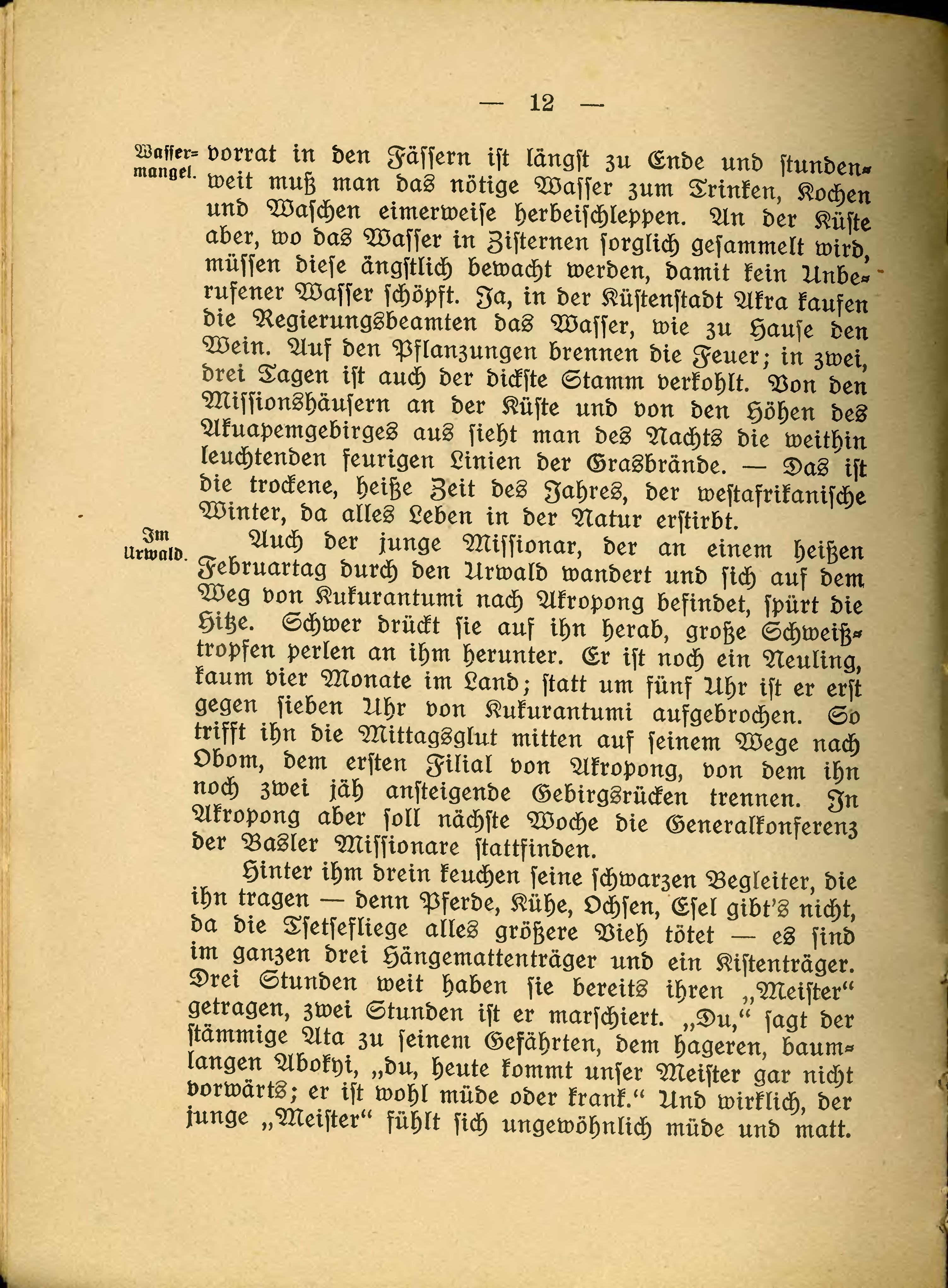 Auch der junge Missionar, der an einem heißen Februartag durch den Urwald wandert und sich auf dem Weg von Kukurantumi nach Akropong befindet, spürt die Hitze. Schwer drückt sie auf ihn herab, große Schweißtropfen perlen an ihm herunter. Er ist noch ein Neuling, kaum vier Monate im Land; statt um fünf Uhr ist er erst gegen sieben Uhr von Kukurantumi aufgebrochen. So trifft ihn die Mittagsglut mitten auf seinem Wege nach Obom, dem ersten Filial von Akropong, von dem ihn noch zwei jäh ansteigende Gebirgsrücken trennen. In Akropong aber soll nächste Woche die Generalkonferenz der Basler Missionare stattfinden.