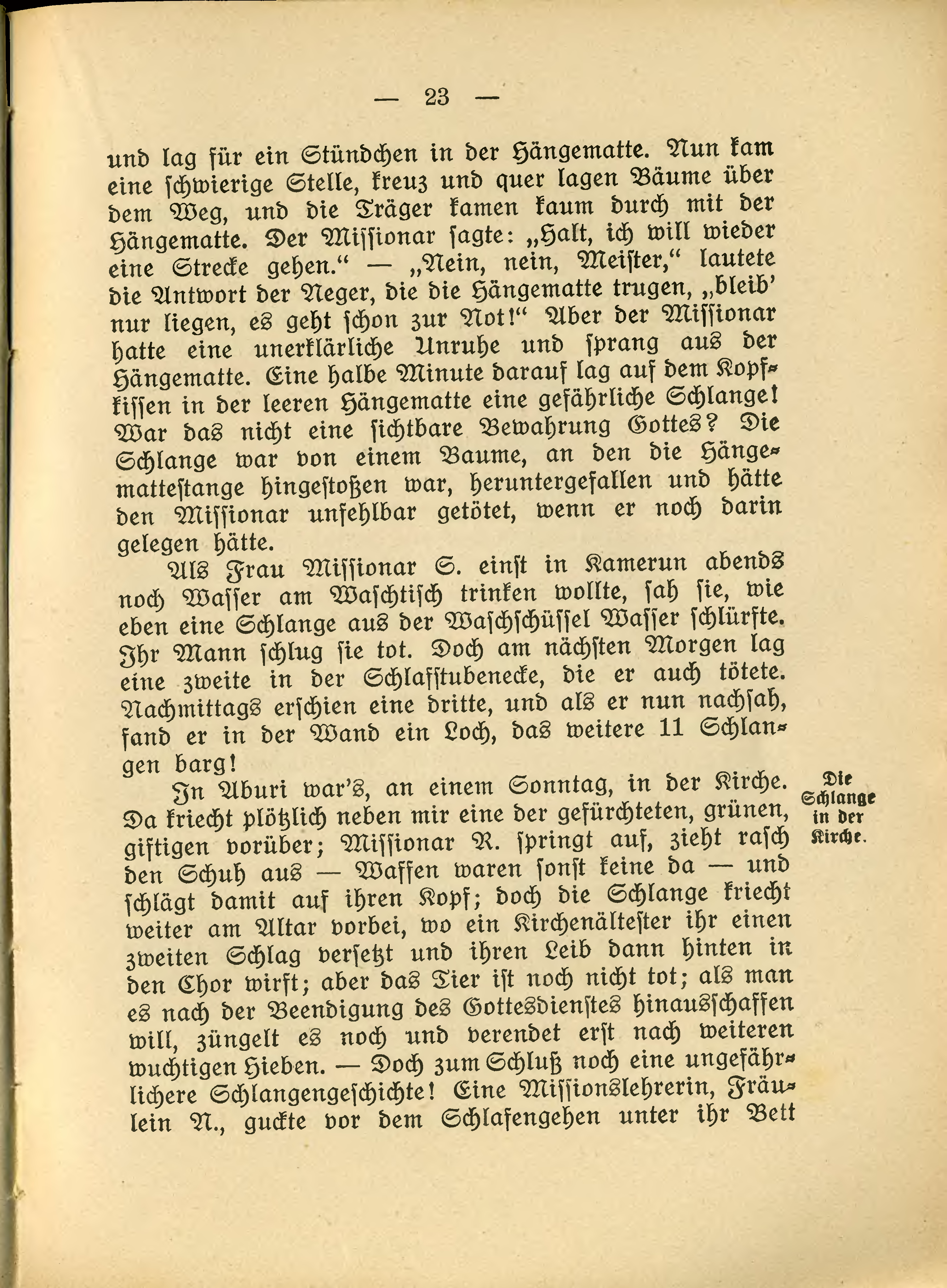 Als Frau Missionar S. einst in Kamerun abends noch Wasser am Waschtisch trinken wollte, sah sie, wie eben eine Schlange aus der Waschschüssel Wasser schlürfte. Ihr Mann schlug sie tot. Doch am nächsten Morgen lag eine zweite in der Schlafstubenecke, die er auch tötete. Nachmittags erschien eine dritte, und als er nun nachsah, fand er in der Wand ein Loch, das weitere 11 Schlangen barg! Die |