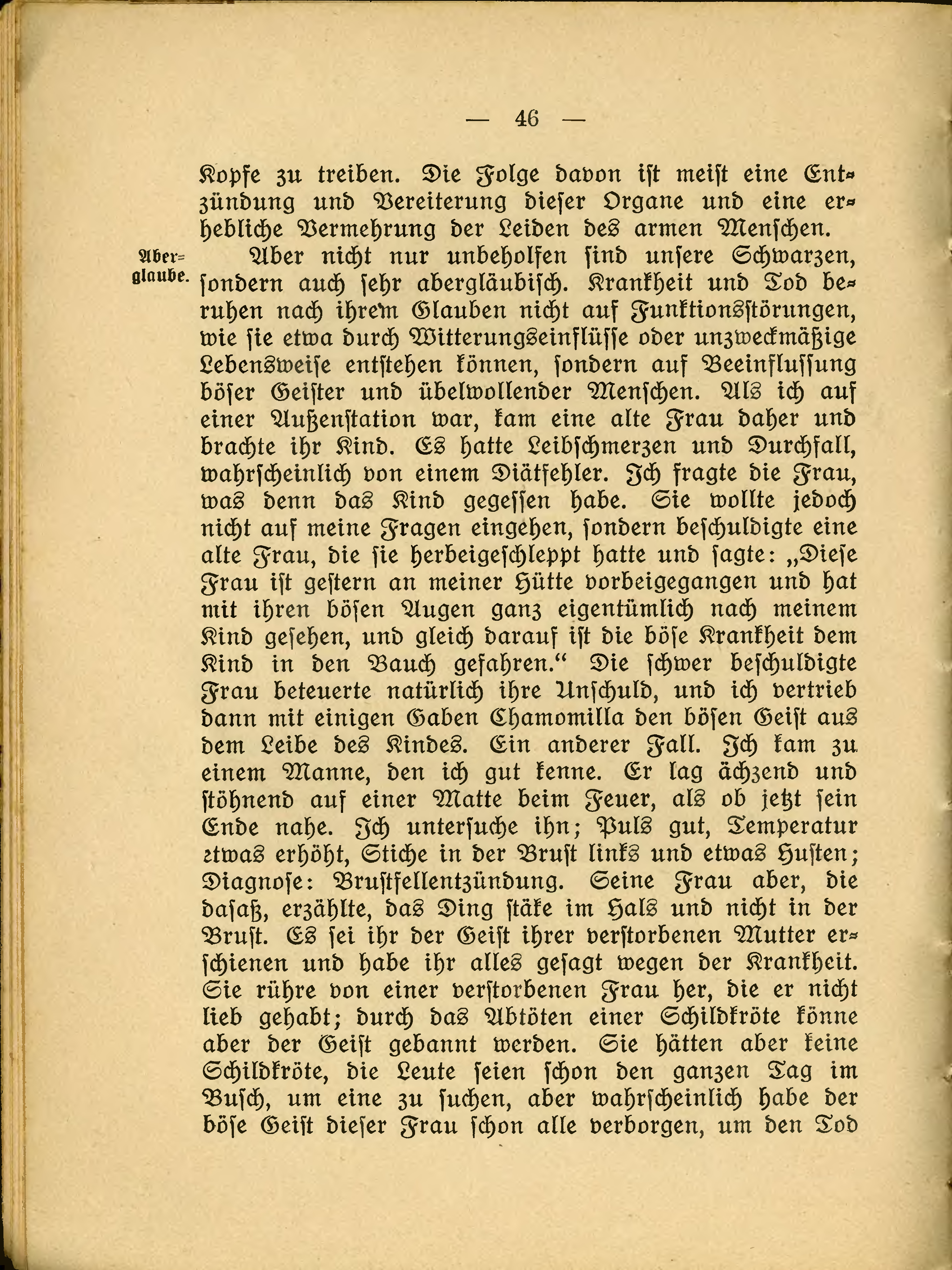 Aber nicht nur unbeholfen sind unsere Schwarzen, sondern auch sehr abergläubisch. Krankheit und Tod beruhen nach ihrem Glauben nicht auf Funktionsstörungen, wie sie etwa durch Witterungseinflüsse oder unzweckmäßige Lebensweise entstehen können, sondern auf Beeinflussung böser Geister und übelwollender Menschen. Als ich auf einer Außenstation war, kam eine alte Frau daher und brachte ihr Kind. Es hatte Leibschmerzen und Durchfall, wahrscheinlich von einem Diätfehler. Ich fragte die Frau, was denn das Kind gegessen habe. Sie wollte jedoch nicht auf meine Fragen eingehen, sondern beschuldigte eine alte Frau, die sie herbeigeschleppt hatte und sagte: „Diese Frau ist gestern an meiner Hütte vorbeigegangen und hat mit ihren bösen Augen ganz eigentümlich nach meinem Kind gesehen, und gleich darauf ist die böse Krankheit dem Kind in den Bauch gefahren.“ Die schwer beschuldigte Frau beteuerte natürlich ihre Unschuld, und ich vertrieb dann mit einigen Gaben Chamomilla den bösen Geist aus dem Leibe des Kindes. Ein anderer Fall. Ich kam zu einem Manne, den ich gut kenne. Er lag ächzend und stöhnend auf einer Matte beim Feuer, als ob jetzt sein Ende nahe. Ich untersuche ihn; Puls gut, Temperatur etwas erhöht, Stiche in der Brust links und etwas Husten; Diagnose: Brustfellentzündung. Seine Frau aber, die dasaß, erzählte, das Ding stäke im Hals und nicht in der Brust. Es sei ihr der Geist ihrer verstorbenen Mutter erschienen und habe ihr alles gesagt wegen der Krankheit. Sie rühre von einer verstorbenen Frau her, die er nicht lieb gehabt; durch das Abtöten einer Schildkröte könne aber der Geist gebannt werden. Sie hätten aber keine Schildkröte, die Leute seien schon den ganzen Tag im Busch, um eine zu suchen, aber wahrscheinlich habe der böse Geist dieser Frau schon alle verborgen, um den Tod