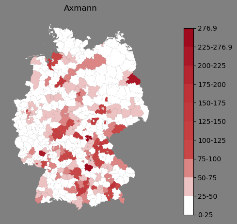 Relative Verteilung des Namens Axmann (1996)Direkt zur Karte Die Farbskala zeigt die Anzahl von "Axmann" bezogen auf je 1 Million Einträge. |