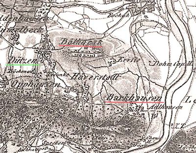 - 13.12.1810 Senatskonsult, Kaiserreich Frankreich, Oberemsdepartement, Arrondissement Minden, Kanton Minden , Mairie Dützen mit 911 Einwohnern und den Bauerschaften Barkhausen mit 376, Bölhorst 236, Häverstädt, Wedigenstein, Hummelbeck, Bierde, Aulhausen, Upphausen (ges. 1.523 Seelen) [1]