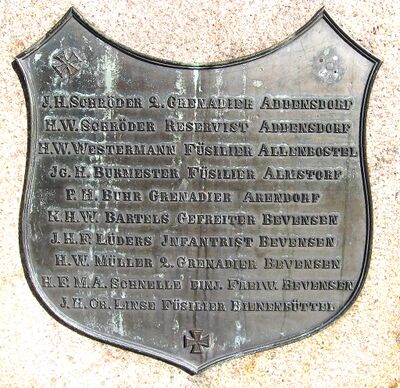| 1871 | Erster Besuch Seiner Majestät des Deutschen Kaisers und Königs von Preußen Wilhelm I. in Bevensen, aufgrund dessen der Beschluss gefasst wird, ein Denkmal zu Ehren der 30 aus dem Amte Medingen stammenden Gefallenen des Deutsch-Französischen Krieges von 1870/71 zu errichten. |