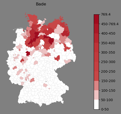 Relative Verteilung des Namens Bade (1996)Direkt zur Karte Die Farbskala zeigt die Anzahl von "Bade" bezogen auf je 1 Million Einträge. |