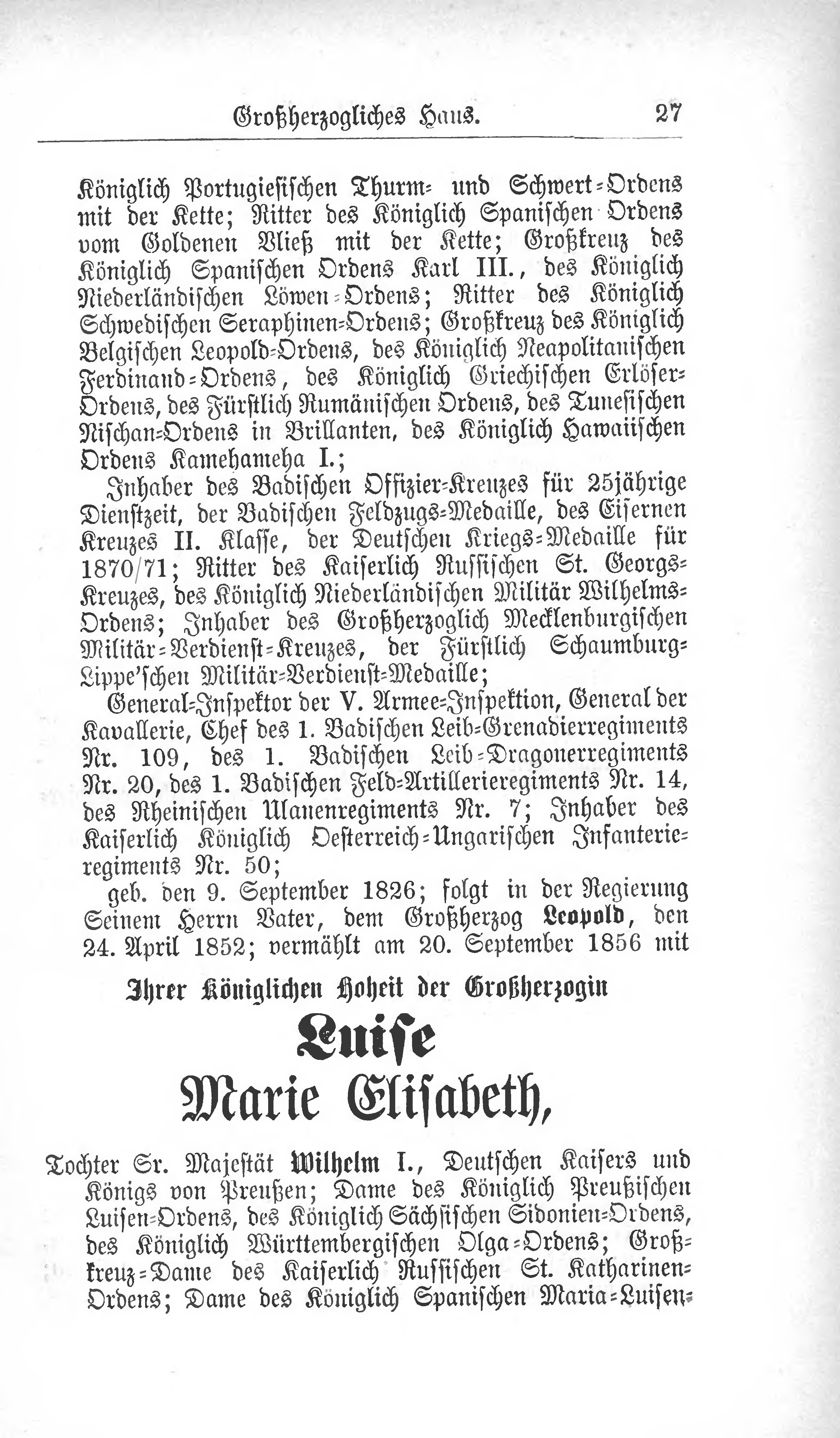 geb. den 9. September 1826; folgt in der Regierung Seinem Herrn Vater, dem Großherzog Leopold, den 24. April 1852; vermählt am 20. September 1856 mit