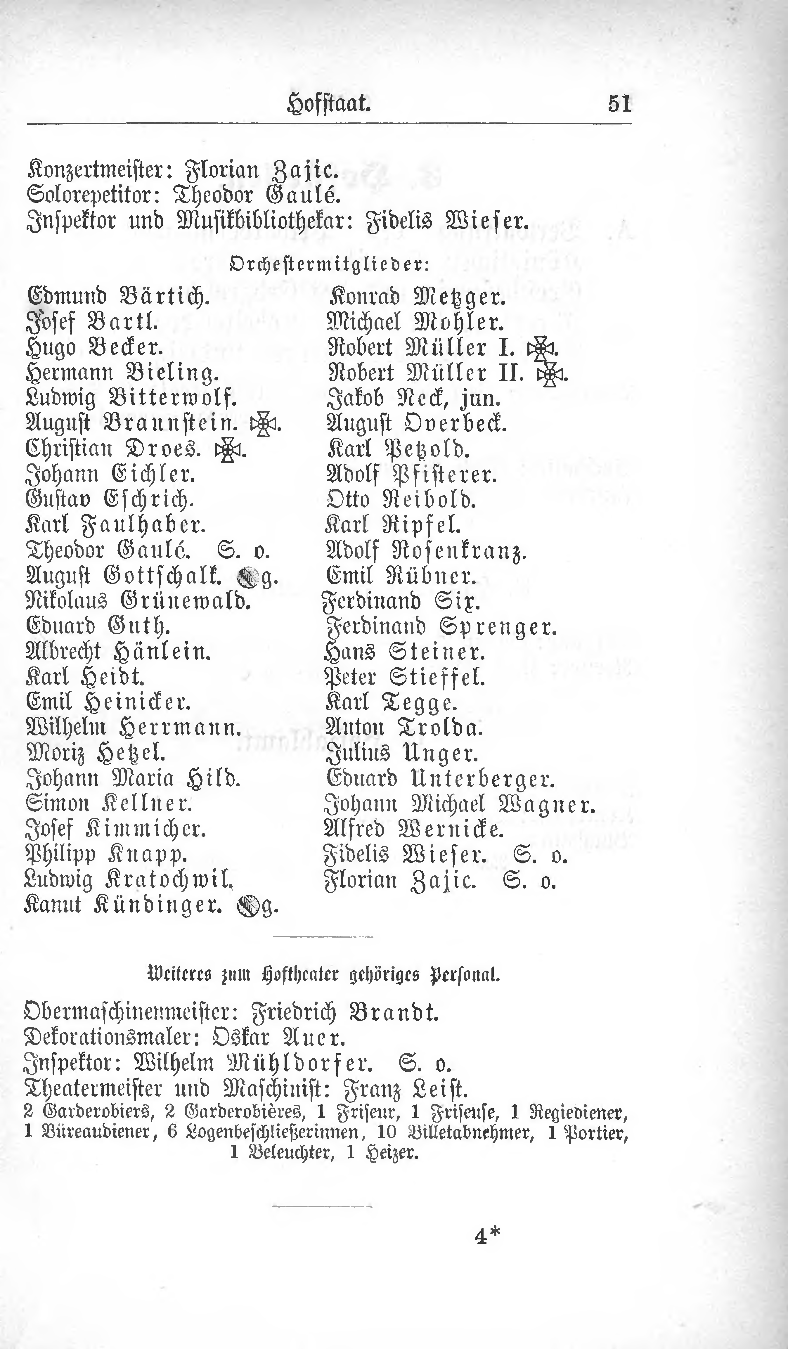 2 Gardarobiers, 2 Gardarobières, 1 Friseur, 1 Friseuse, 1 Regiediener, 1 Bureaudiener, 6 Logenbeschließerinnen, 10 Billetabnehmer, 1 Portier, 1 Beleuchter, 1 Heizer.