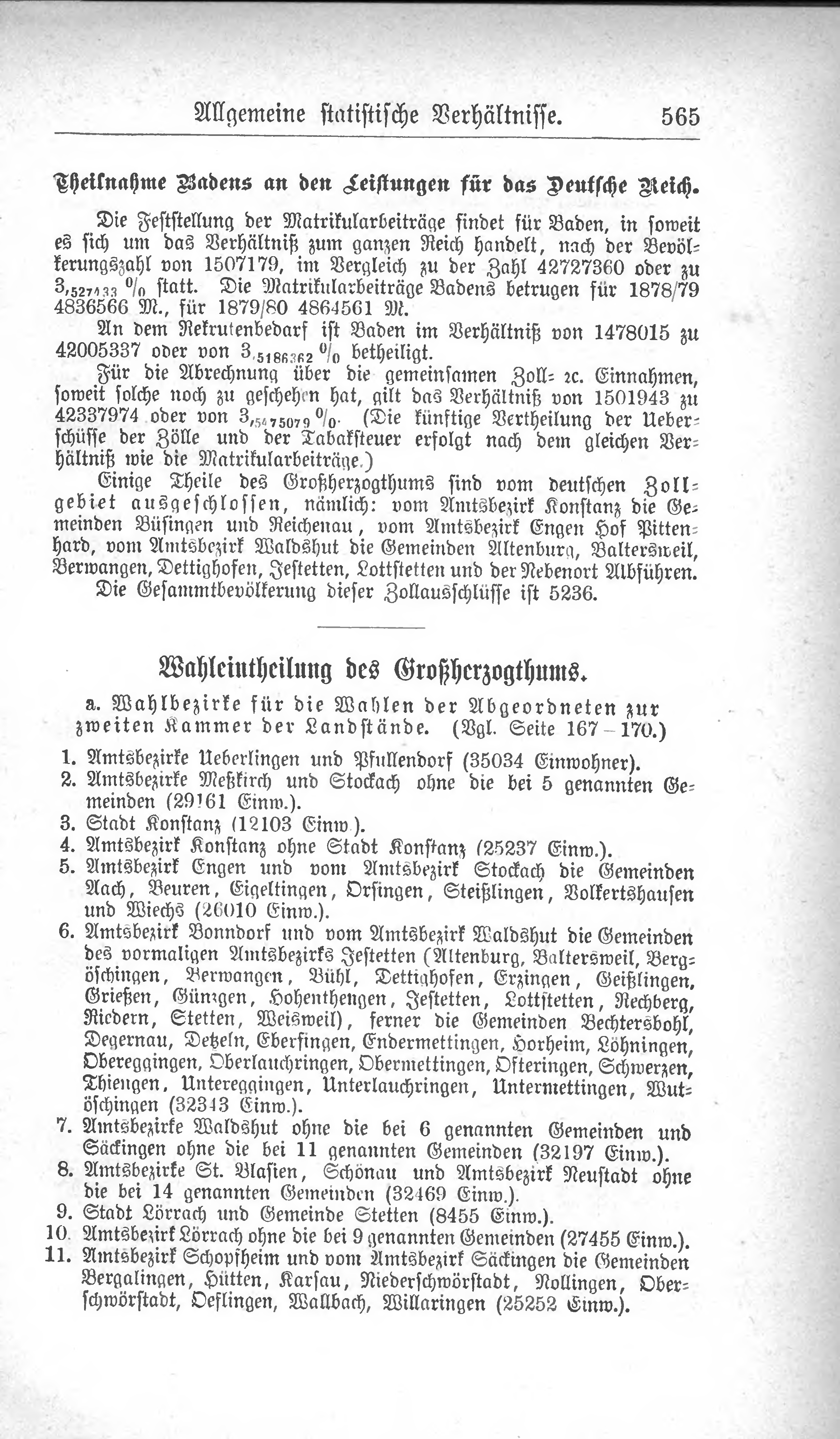 Einige Theile des Großherzogthums sin vom deutschen Zollgebiet ausgeschlossen, nämlich: vom Amtsbezirk Konstanz die Gemeinden Büsingen und Reichenau, von AMtsbezirk Engen Hpf Pittenhard, vom Antsbezirk Waldshut die Gemeinden Altenburg, Balteresweil, Berwangen, Dettighofen, Jestetten, Lottstetten und der Nebenort Albführen.