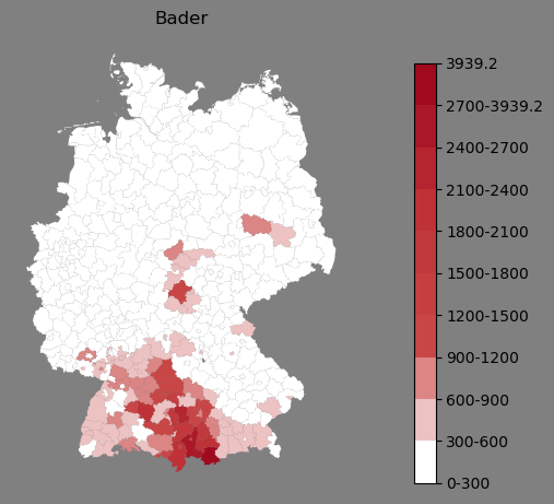Relative Verteilung des Namens Bader (1996)Direkt zur Karte Die Farbskala zeigt die Anzahl von "Bader" bezogen auf je 1 Million Einträge. |