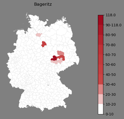 Relative Verteilung des Namens Bageritz (1996)Direkt zur Karte Die Farbskala zeigt die Anzahl von "Bageritz" bezogen auf je 1 Million Einträge. |