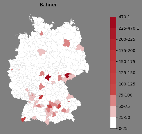 Relative Verteilung des Namens Bahner (1996)Direkt zur Karte Die Farbskala zeigt die Anzahl von "Bahner" bezogen auf je 1 Million Einträge. |