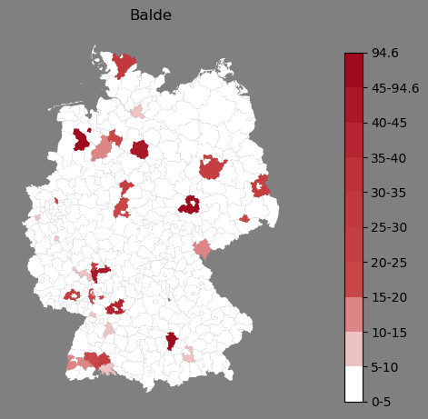 Relative Verteilung des Namens Balde (1996)Direkt zur Karte Die Farbskala zeigt die Anzahl von "Balde" bezogen auf je 1 Million Einträge. |