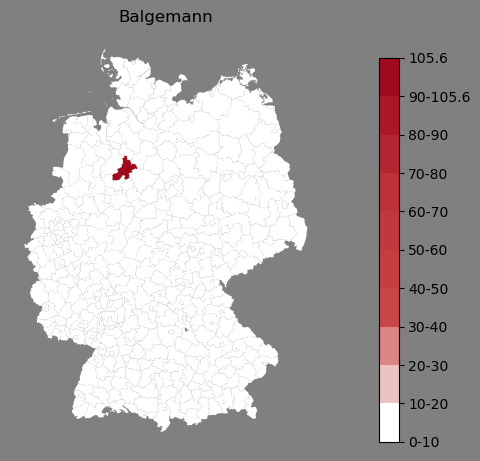 Relative Verteilung des Namens Balgemann (1996)Direkt zur Karte Die Farbskala zeigt die Anzahl von "Balgemann" bezogen auf je 1 Million Einträge. |