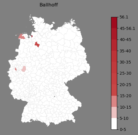 Relative Verteilung des Namens Ballhoff (1996)Direkt zur Karte Die Farbskala zeigt die Anzahl von "Ballhoff" bezogen auf je 1 Million Einträge. |