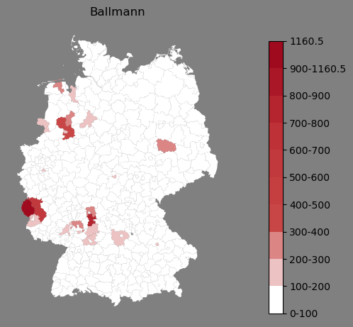 Absolute Verteilung des Namens Ballmann (1890)Direkt zur Karte Absolute Verteilung des Namens "Ballmann" um 1890 im damaligen Deutschen Reich Sie können die Karte innerhalb des Fensters zoomen und verschieben. |
