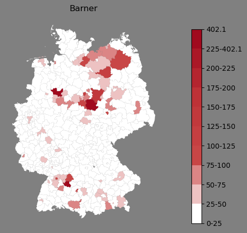 Relative Verteilung des Namens Barner (1996)Direkt zur Karte Die Farbskala zeigt die Anzahl von "Barner" bezogen auf je 1 Million Einträge. |