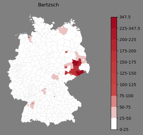 Absolute Verteilung des Namens Bartzsch (1890)Direkt zur Karte Absolute Verteilung des Namens "Bartzsch" um 1890 im damaligen Deutschen Reich Sie können die Karte innerhalb des Fensters zoomen und verschieben. |