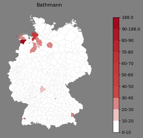 Relative Verteilung des Namens Bathmann (1996)Direkt zur Karte Die Farbskala zeigt die Anzahl von "Bathmann" bezogen auf je 1 Million Einträge. |