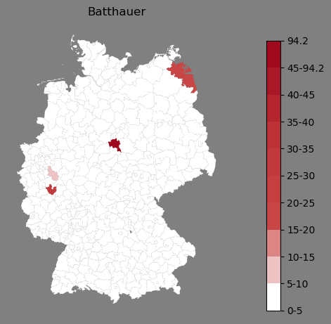 Absolute Verteilung des Namens Batthauer (1890)Direkt zur Karte Absolute Verteilung des Namens "Batthauer" um 1890 im damaligen Deutschen Reich Sie können die Karte innerhalb des Fensters zoomen und verschieben. |