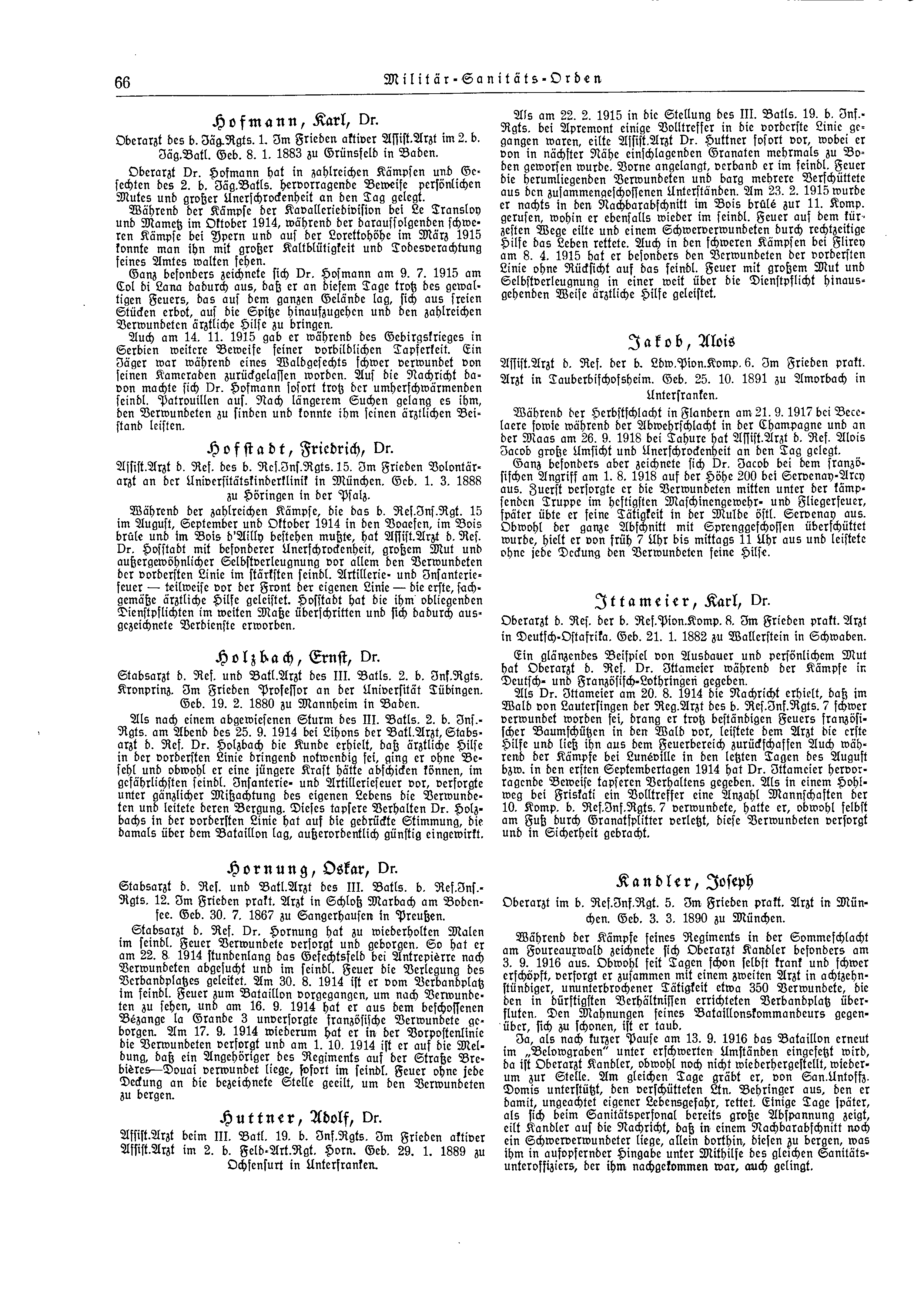 Assist.Arzt d. Res. des b. Res.Inf.Rgts 15. Im Frieden Volontärarzt an der Universitätskinderklinik in München. Geb. 1. 3. 1888 zu Höringen in der Pfalz.