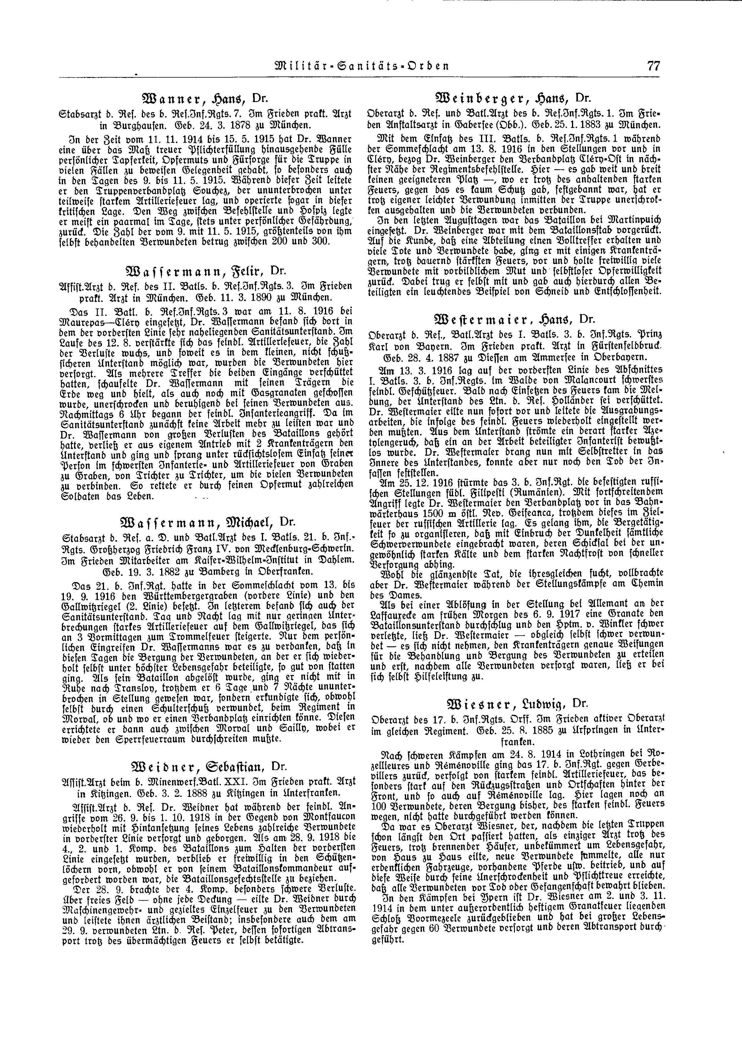 Stabsarzt d. Res. a. D. und Batl.Arzt des I. Batls. 21. b. Inf.Rgts. Großherzog Friedrich Franz IV. von Mecklenburg-Schwerin. Im Frieden Mitarbeiter am Kaiser-Wilhelm-Institut in Dahlem. Geb. 19. 3. 1882 zu Bamberg in Oberfranken.