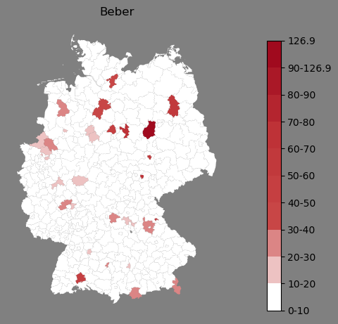 Relative Verteilung des Namens Beber (1996)Direkt zur Karte Die Farbskala zeigt die Anzahl von "Beber" bezogen auf je 1 Million Einträge. |