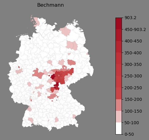 Absolute Verteilung des Namens Bechmann (1890)Direkt zur Karte Absolute Verteilung des Namens "Bechmann" um 1890 im damaligen Deutschen Reich Sie können die Karte innerhalb des Fensters zoomen und verschieben. |