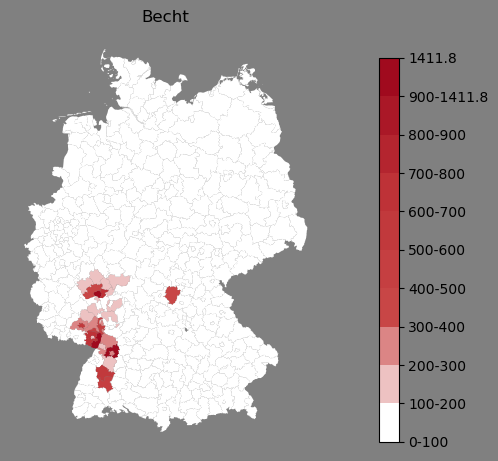 Relative Verteilung des Namens Becht (1996)Direkt zur Karte Die Farbskala zeigt die Anzahl von "Becht" bezogen auf je 1 Million Einträge. |