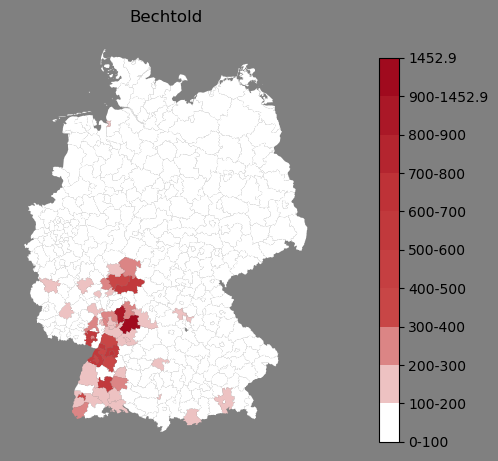 Absolute Verteilung des Namens Bechtold (1890)Direkt zur Karte Absolute Verteilung des Namens "Bechtold" um 1890 im damaligen Deutschen Reich Sie können die Karte innerhalb des Fensters zoomen und verschieben. |