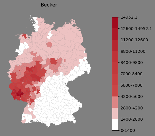Absolute Verteilung des Namens Becker (1890)Direkt zur Karte Absolute Verteilung des Namens "Becker" um 1890 im damaligen Deutschen Reich Sie können die Karte innerhalb des Fensters zoomen und verschieben. |