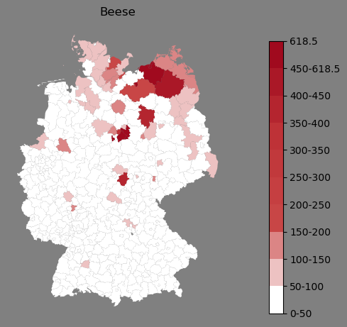 Absolute Verteilung des Namens Beese (1890)Direkt zur Karte Absolute Verteilung des Namens "Beese" um 1890 im damaligen Deutschen Reich Sie können die Karte innerhalb des Fensters zoomen und verschieben. |