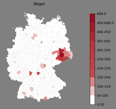 Relative Verteilung des Namens Beger (1996)Direkt zur Karte Die Farbskala zeigt die Anzahl von "Beger" bezogen auf je 1 Million Einträge. |