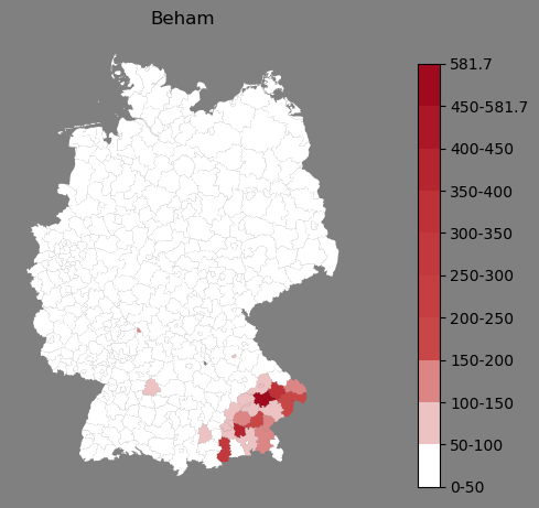 Relative Verteilung des Namens Beham (1996)Direkt zur Karte Die Farbskala zeigt die Anzahl von "Beham" bezogen auf je 1 Million Einträge. |