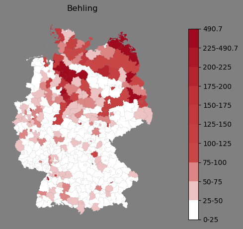 Absolute Verteilung des Namens Behling (1890)Direkt zur Karte Absolute Verteilung des Namens "Behling" um 1890 im damaligen Deutschen Reich Sie können die Karte innerhalb des Fensters zoomen und verschieben. |