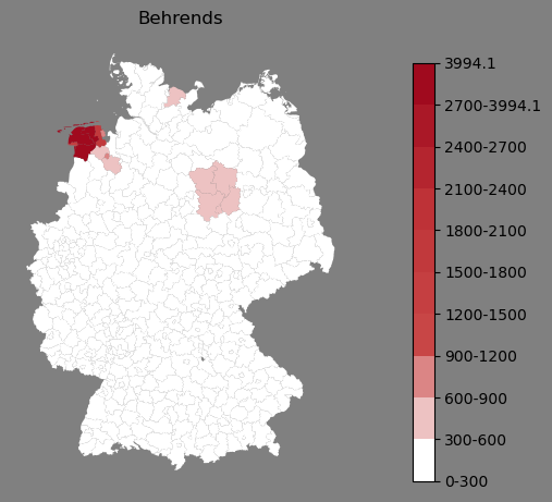 Relative Verteilung des Namens Behrends (1996)Direkt zur Karte Die Farbskala zeigt die Anzahl von "Behrends" bezogen auf je 1 Million Einträge. |