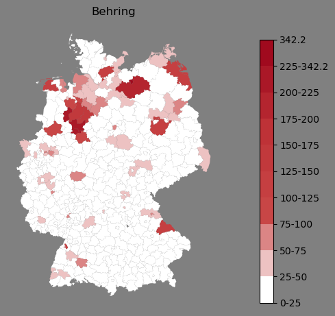 Relative Verteilung des Namens Behring (1996)Direkt zur Karte Die Farbskala zeigt die Anzahl von "Behring" bezogen auf je 1 Million Einträge. |