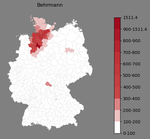 Absolute Verteilung des Namens Behrmann (1890)Direkt zur Karte Absolute Verteilung des Namens "Behrmann" um 1890 im damaligen Deutschen Reich Sie können die Karte innerhalb des Fensters zoomen und verschieben. |