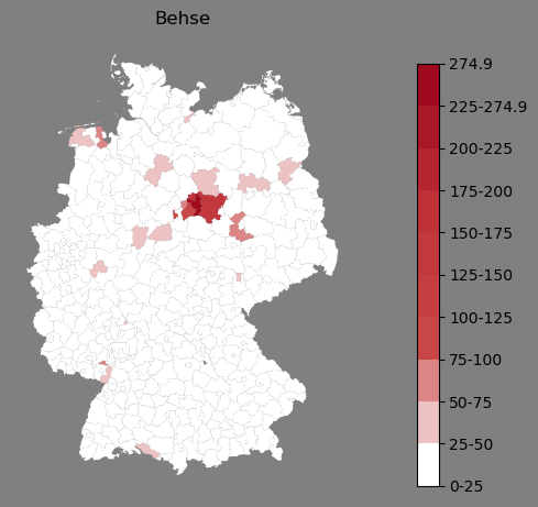 Absolute Verteilung des Namens Behse (1890)Direkt zur Karte Absolute Verteilung des Namens "Behse" um 1890 im damaligen Deutschen Reich Sie können die Karte innerhalb des Fensters zoomen und verschieben. |