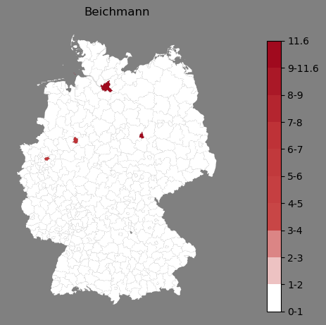 Absolute Verteilung des Namens Beichmann (1890)Direkt zur Karte Absolute Verteilung des Namens "Beichmann" um 1890 im damaligen Deutschen Reich Sie können die Karte innerhalb des Fensters zoomen und verschieben. |