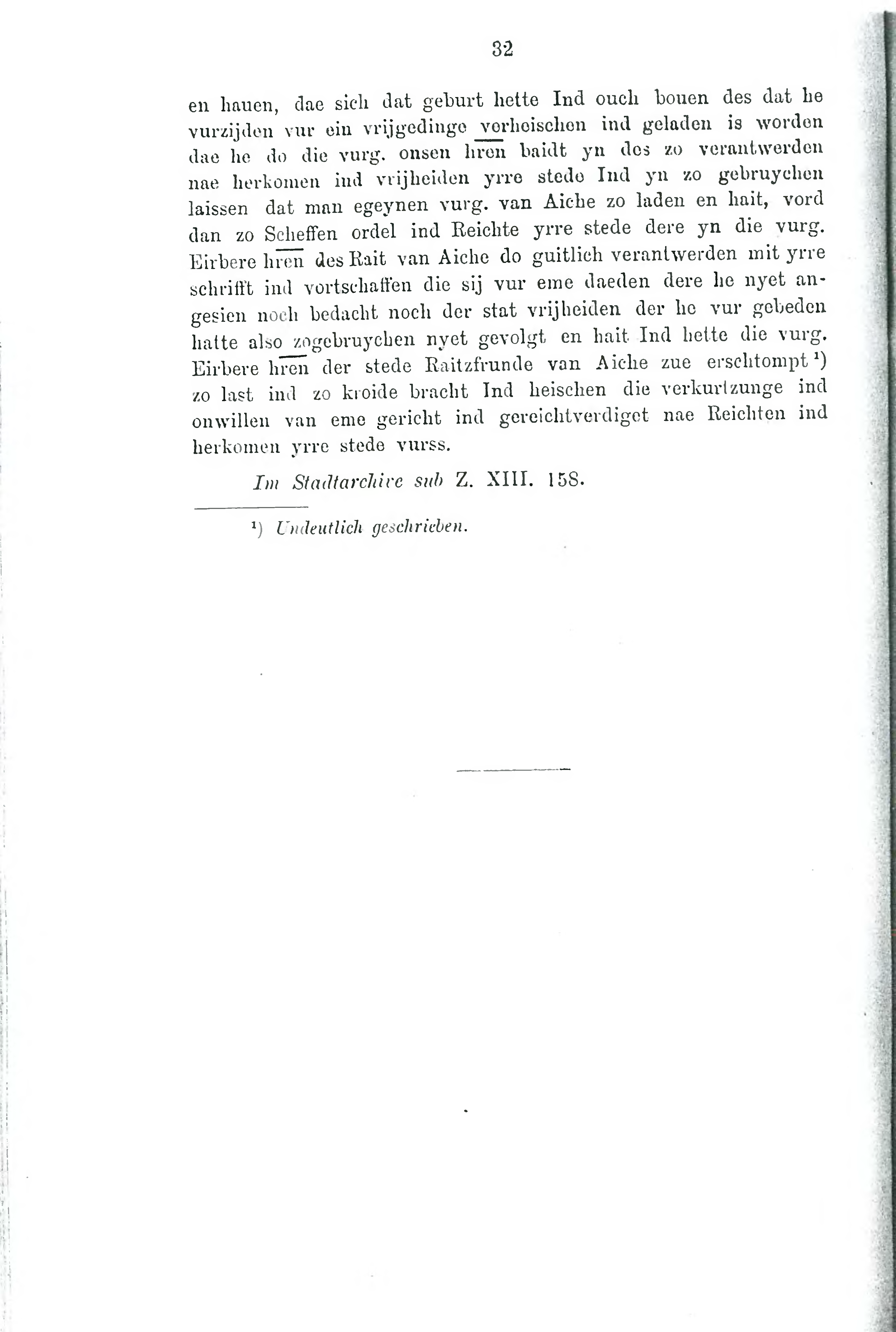 en hauen, dae sich dat geburt hette Ind ouch bouen des dat he vurzijden vur ein vrijgedinge verheischen ind geladen is worden dae he do die vurg. onsen hren baidt yn des zo verantwerden nae herkomen ind vrijheiden yrre stede Ind yn zo gebruychen laissen dat man egeynen vurg. van Aiche zo laden en hait, vord dan zo Scheffen ordel ind Reichte yrre stede dere yn die vurg. Eirbere hren des Rait van Aiche do guitlich verantwerden mit yrre schrifft ind vortschaffen die sij vur eme daeden dere he nyet angesien noch bedacht noch der stat vrijheiden der he vur gebeden hatte also zogebruychen nyet gevolgt en hait Ind hette die vurg. Eirbere hren der stede Raitzfrunde van Aiche zue erschtompt [1] zo last ind zo kroide bracht Ind heischen die verkurtzunge ind onwillen van eme gericht ind gereichtverdiget nae Reichten ind herkomen yrre stede vurss.