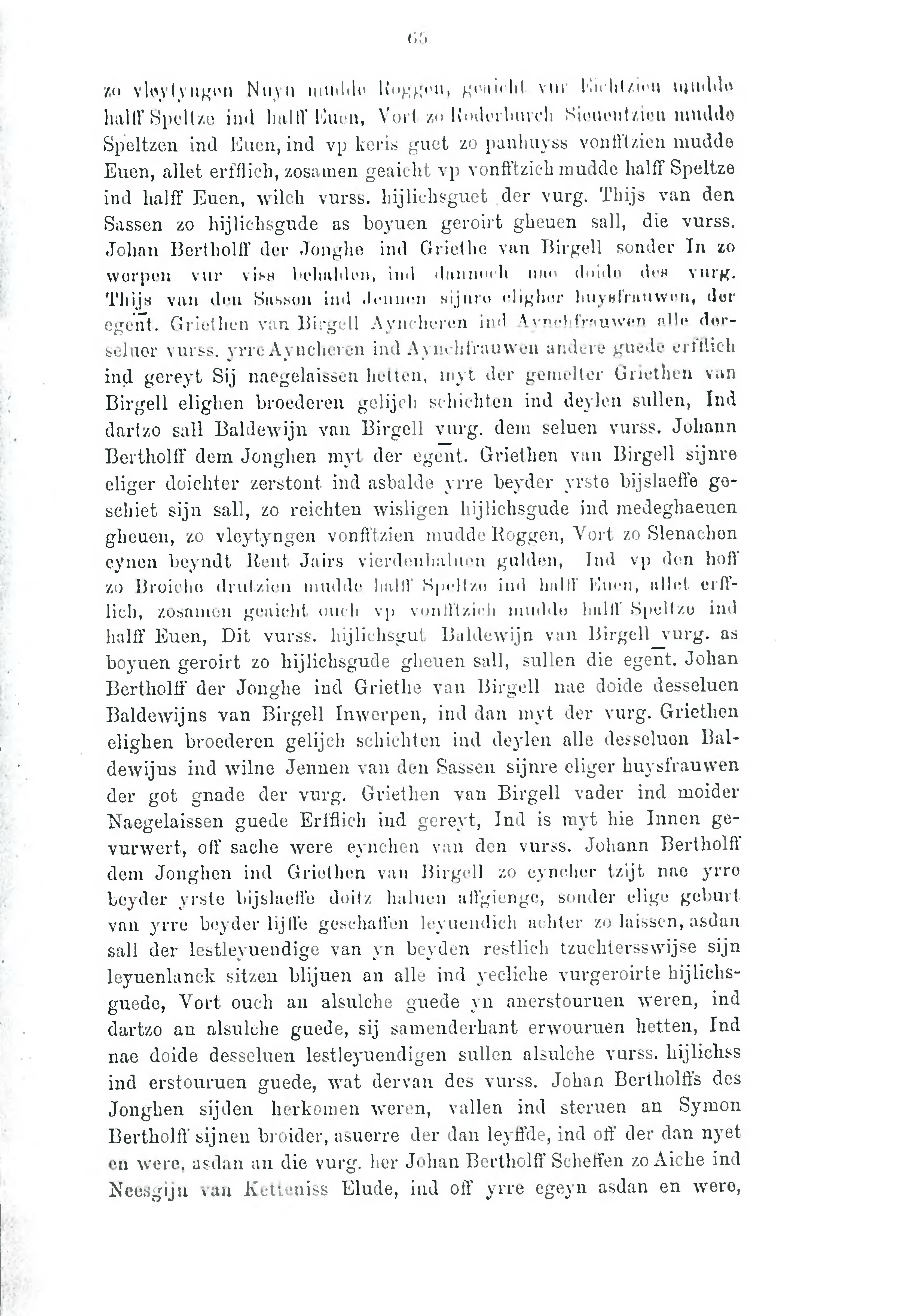 zo vleytyngen Nuyn mudde Roggen, geaicht vur Eichtzien mudde halff Speltze ind halff Euen, Vort zo Roderburch Sieuentzien mudde Speltzen ind Euen, ind vp keris guet zo panhuyss vonfftzien mudde Euen, allet erfflich, zosamen geaicht vp vonfftzich mudde halff Speltze ind halff Euen, wilch vurss. hijlichsguet der vurg. Thijs van den Sassen zo hijlichsgude as boyuen geroirt gheuen sali, die vurss. Johan Bertholff der Jonghe ind Griethe van Birgell sonder In zo worpen vur viss behalden, ind dannoch nae doide des vurg. Thijs van den Sassen ind Jennen sijnre eligher huysfrauwen, der egent. Griethen van Birgell Ayncheren ind Aynchfrauwen alle derseluer vurss. yrre Ayncheren ind Aynchfrauwen andere guede erfflich ind gereyt Sij naegelaissen hetten, myt der gemelter Griethen van Birgell elighen broederen gelijch schichten ind deylen sullen, Ind dartzo sall Baldewijn van Birgell vurg. dem seluen vurss. Johann Bertholff dem Jonghen myt der egent. Griethen van Birgell sijnre eliger doichter zerstont ind asbalde yrre beyder yrsto bijslaeffe geschiet sijn sall, zo reichten wisligen hijlichsgude ind medeghaeuen gheuen, zo vleytyngen vonfftzien mudde Roggen, Vort zo Slenachen eynen beyndt Rent Jairs vierdenhaluen gulden, Ind vp den hoff zo Broiche drutzien mudde halff Speltze ind halff Euen, allet erfflich, zosamen geaicht ouch vp vonfftzich mudde halff Speltze ind halff Euen, Dit vurss. hijlichsgut Baldewijn van Birgell vurg. as boyuen geroirt zo hijlichsgude gheuen sall, sullen die egent. Johan Bertholff der Jonghe ind Griethe van Birgell nae doide desseluen Baldewijns van Birgell Inwerpen, ind dan myt der vurg. Griethen elighen broederen gelijch schichten ind deylen alle desseluen Baldewijns ind wilne Jennen van den Sassen sijnre eliger huysfrauwen der got gnade der vurg. Griethen van Birgell vader ind moider Naegelaissen guede Erfflich ind gereyt, Ind is myt hie Innen gevurwert, off sache were eynchen van den vurss. Johann Bertholff dem Jonghen ind Griethen van Birgell zo eyncher tzijt nae yrre beyder yrste bijslaeffe doitz haluen affgienge, sonder elige geburt van yrre beyder lijffe geschaffen leyuendich achter zo laissen, asdan sall der lestleyuendige van yn beyden restlich tzuchtersswijse sijn leyuenlanck sitzen blijuen an alle ind yecliche vurgeroirte hijlichsguede, Vort ouch an alsulche guede yn anerstouruen weren, ind dartzo an alsulche guede, sij samenderhant erwouruen hetten, Ind nae doide desseluen lestleyuendigen sullen alsulche vurss. hijlichss ind erstouruen guede, wat dervan des vurss. Johan Bertholffs des Jonghen sijden herkomen weren, vallen ind steruen an Symon Bertholff sijnen broider, asuerre der dan leyffde, ind off der dan nyet en were. asdan an die vurg. her Johan Bertholff Scheffen zo Aiche ind Neesgijn van Ketteniss Elude, ind off yrre egeyn asdan en were,